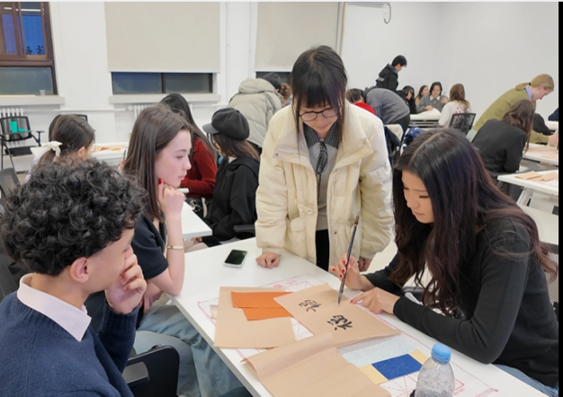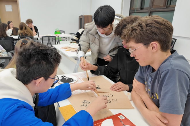 当晚,学院特别联合北航学生书法社团,为法国师生开设了一堂别开生面的中国书法体验课。在社团同学的悉心示范下,法国学生们提笔蘸墨,从横竖撇捺练起,在一笔一画间感悟中国传统文化的深邃与雅致。中法学生以墨为媒,在翰墨飘香中拉近了彼此的距离。