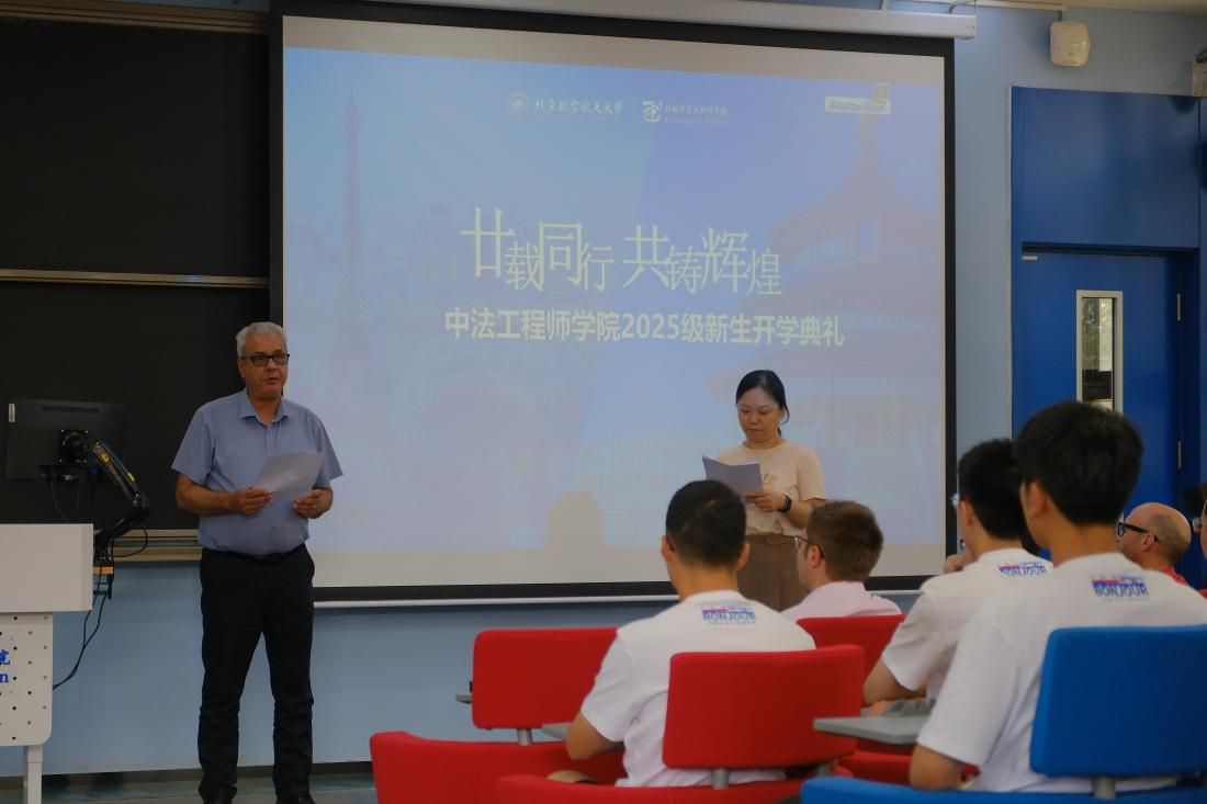 学院中方院长耿立升代表学院向新同学表示热烈欢迎,并为同学们介绍了学院发展历程与现状。作为全国首家中法合作办学机构,学院始终秉持“中法携手、合作共赢”的办学理念,培养了超1100名具有国际视野与全球胜任力的卓越工程师,积累了丰富的合作办学经验,形成了预科工程师一体化和本硕贯通的培养新范式。同时,耿院长嘱咐初入大学的同学们要调整心态、享受学习过程、超越自我,将个人发展融入强国建设的伟大实践,与国家发展同频共振,书写人生的壮丽篇章。