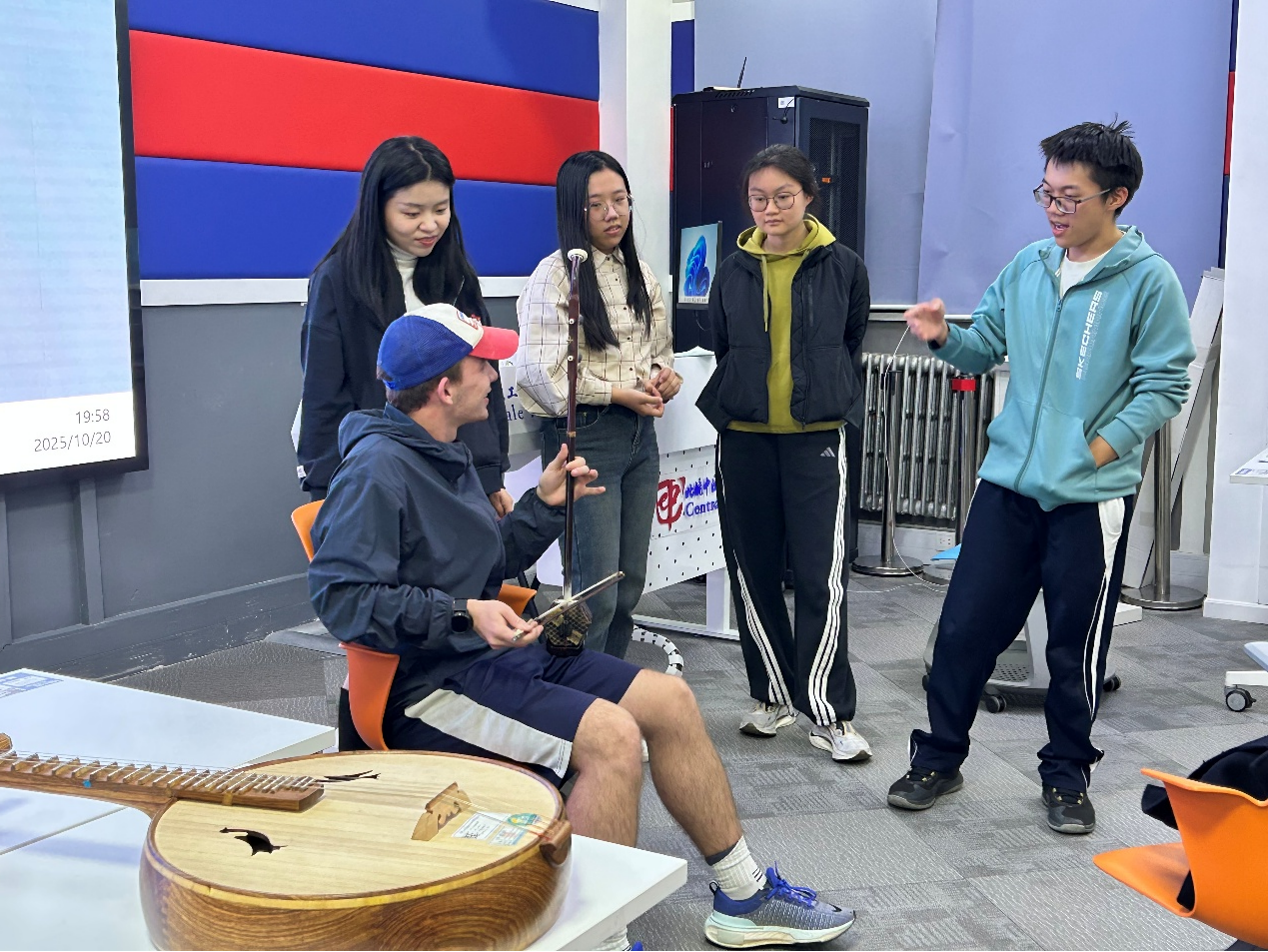 20日晚,在学校学生艺术团和书法社团的支持下,法国师生体验了中国民族乐器和书法文化。