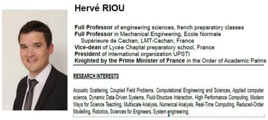 Hervé RIOU教授本人为法国工业科学与技术教师联盟(UPSTI)的荣誉主席,UPSTI是一个致力于推动法国工程师教育发展的国际组织,其成员包括众多知名的工程师学院和教育机构。Hervé RIOU教授本人曾因在教育领域的杰出贡献,荣获法国总理授予的学术棕榈勋章。