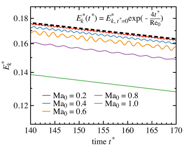 在振荡衰减阶段,动能整体呈指数衰减并叠加小幅振荡(图5)。研究揭示该振荡源于内能与可压缩动能之间通过压力-膨胀项进行的周期性声学能量交换。尽管可压缩动能占比极小,却是连接不可压缩动能与内能、实现可逆能量交换的关键媒介。