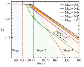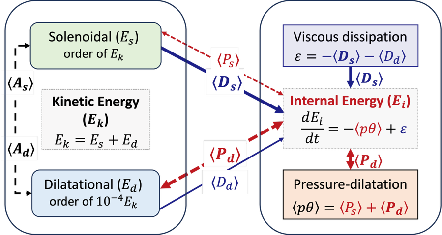 作为航空航天、能源动力等领域的关键基础问题,可压缩流动中的能量交换机制长期备受关注。与不可压缩湍流不同,可压缩流动中存在通过压力-膨胀项实现的动能与内能之间的可逆能量交换,这直接影响流动的演化、耗散等特性。然而,现有研究多集中于充分发展的湍流,对从纯无旋初始场到准平衡态的初始过渡阶段,尤其是初始马赫数对流体发展过程中能量传输的影响,尚缺乏系统认识。