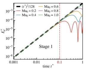 在压缩性生成阶段,团队基于弱可压缩假设,从理论上推导了可压缩速度场的生成机制,并得到数值模拟结果的验证(图3)。研究表明,该阶段可压缩动能随时间呈二次方增长,来源于不可压缩动能的平流输运,且该过程与初始马赫数无关。