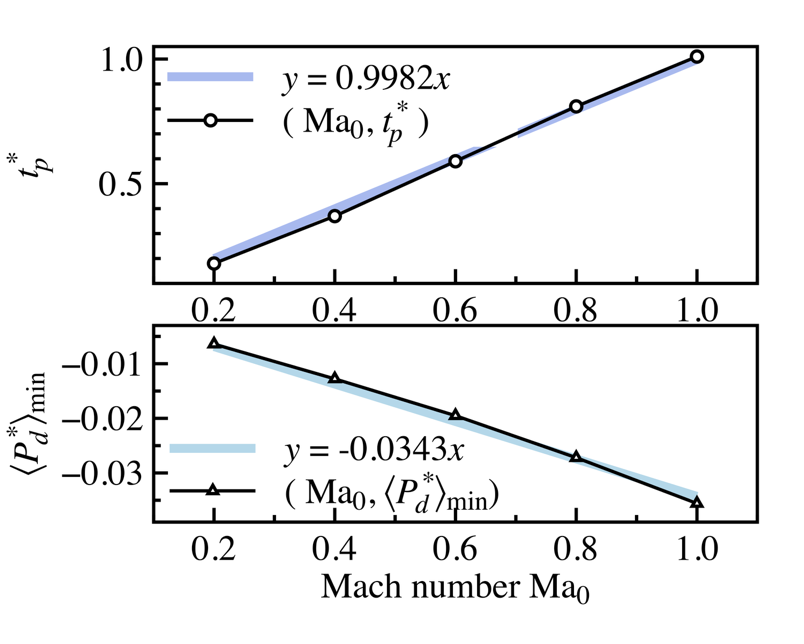 在过渡阶段,初始马赫数的影响显著增强。较高马赫数下流动压缩性大幅提升,甚至诱发激波,显著增强了动能耗散。研究进一步建立了膨胀压力-膨胀项极小值出现时间与初始马赫数之间的线性关系(图4)。